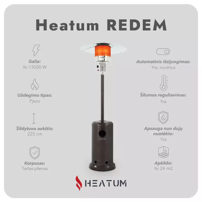 - Heatum Redem šildytuvo konstrukcija yra papildomai sutvirtinta, lengvai surenkama. Lauko šildytuvo gaminimui panaudotas milteliniu būdu dažytas plienas yra storesnis, lyginant su daugeliu tokios formos parduodamų šildytuvų. Dėl šios priežasties, mūsų parduodamas Heatum Redem šildytuvas, sverdamas 19 kg gali būti keliais kilogramais sunkesnis, nei kitų gamintojų. Nedidelis svorio skirtumas jums transportuojant ar perstatant nepasijaus, tačiau pačio šildytuvo tvirtumui, ypač naudojant vėjuotą dieną, tai didelis indėlis.