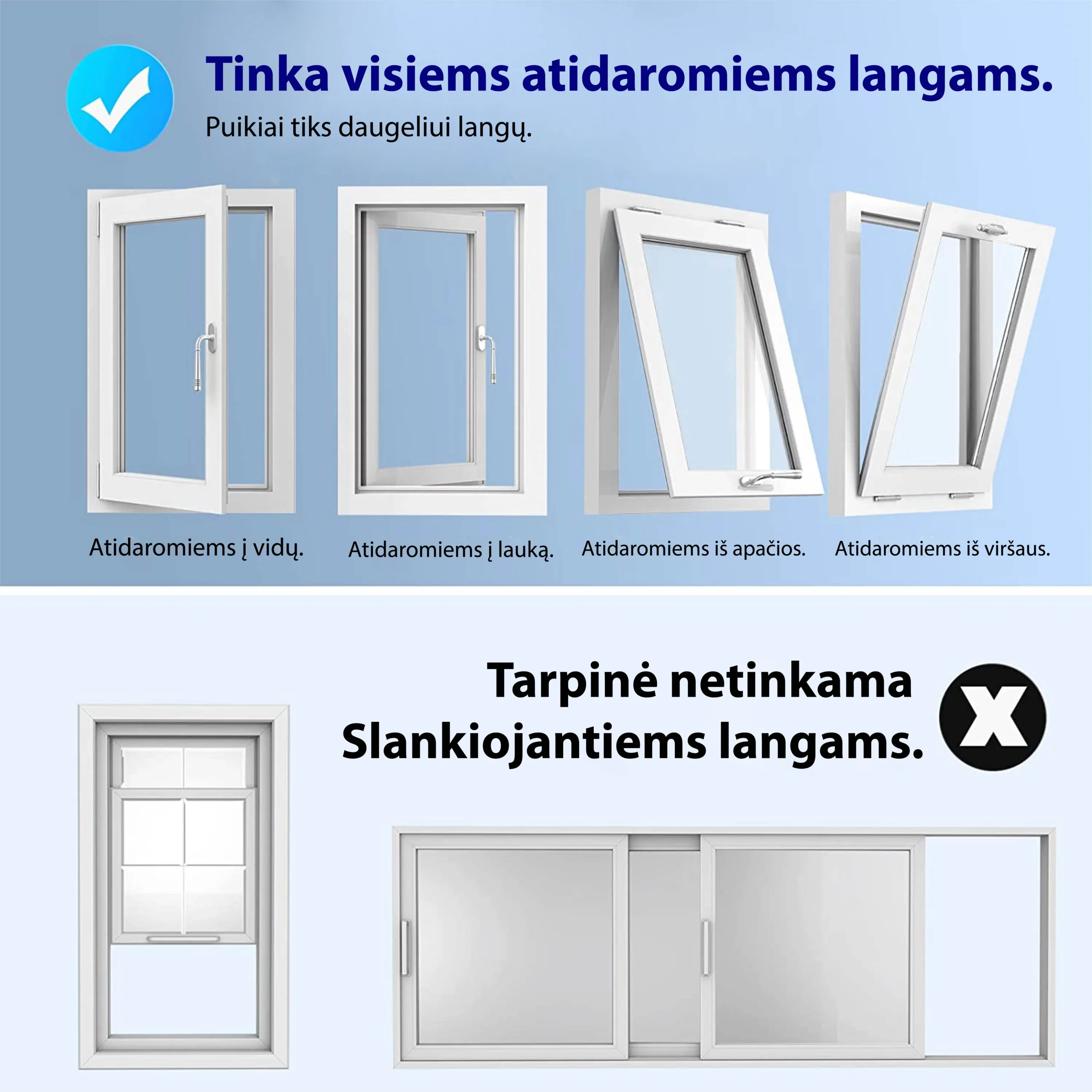 | Langų tipai | Tinka visiems varstomiems langams, kurių perimetras iki 400 cm. |