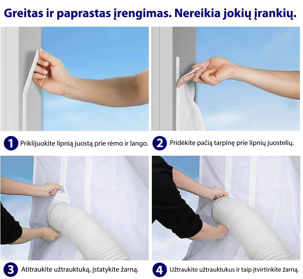 Labai paprastas montavimas. Nereikia atlikti jokių sudėtingesnių veiksmų, pavyzdžiui, gręžti skylių ar naudoti papildomų įrankių. Vadovaukitės išsamiomis instrukcijomis ir montavimą atliksite vos per kelias minutes. Reikės tik užklijuoti lipnią tvirtinimo detalę ant rėmo, priklijuoti lango tarpinę, uždėti išmetimo žarną ir užtraukti užtrauktukus.