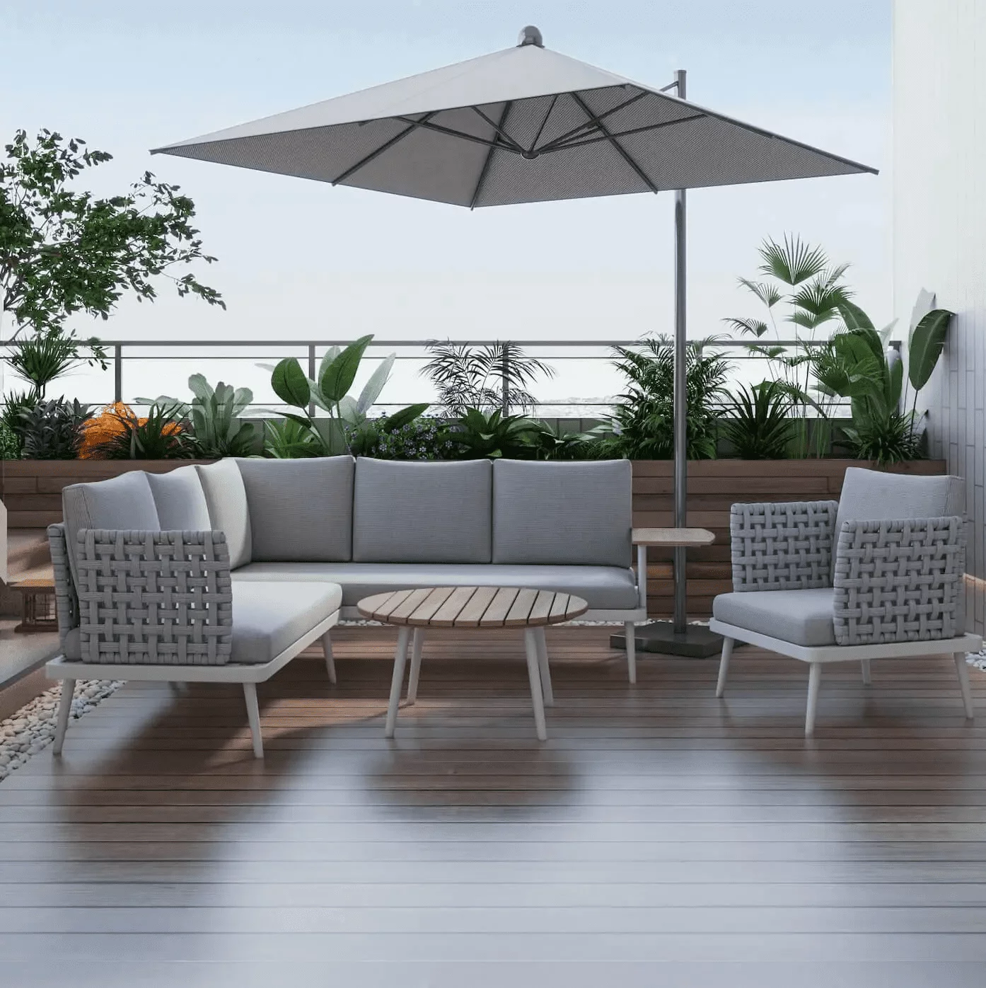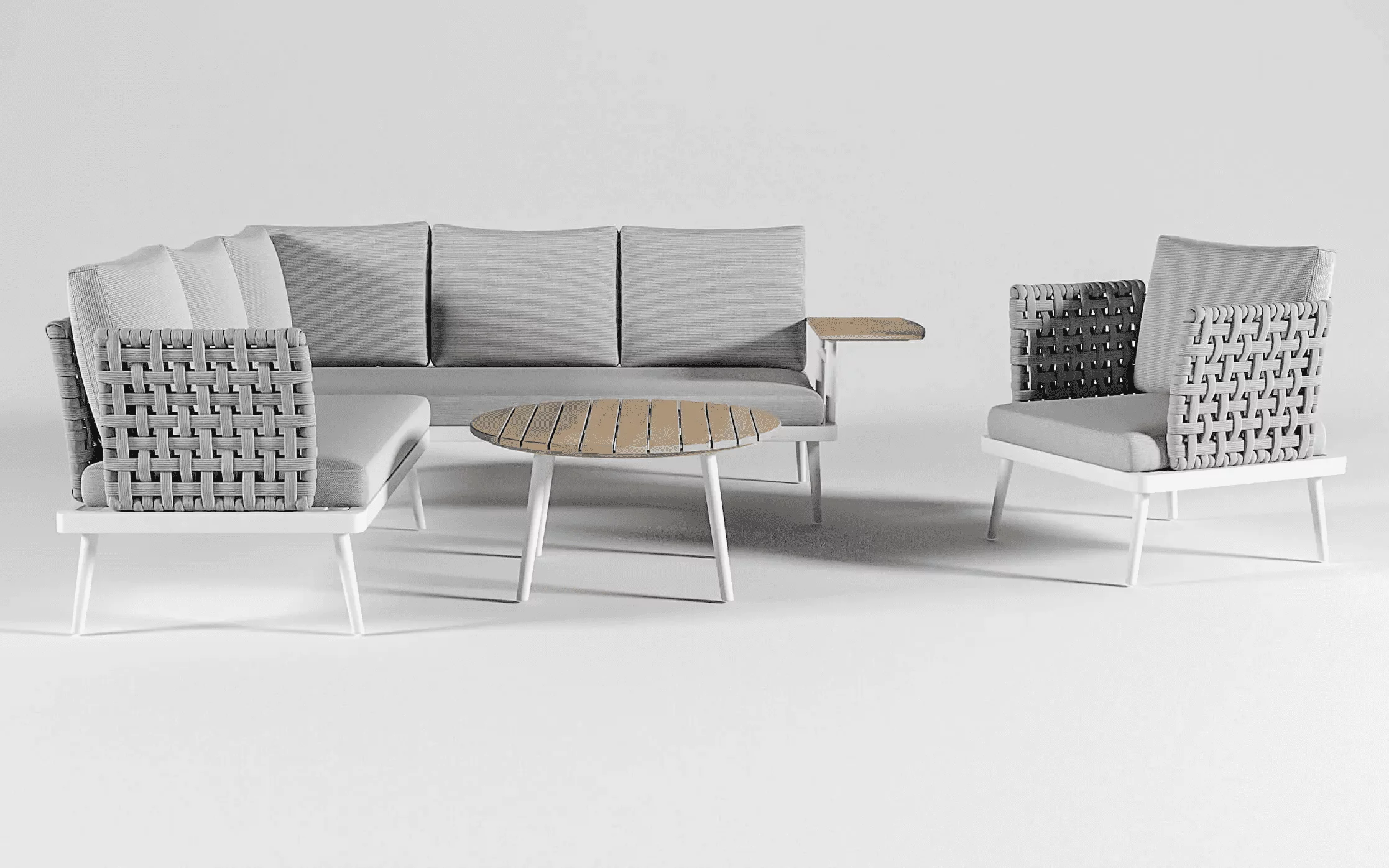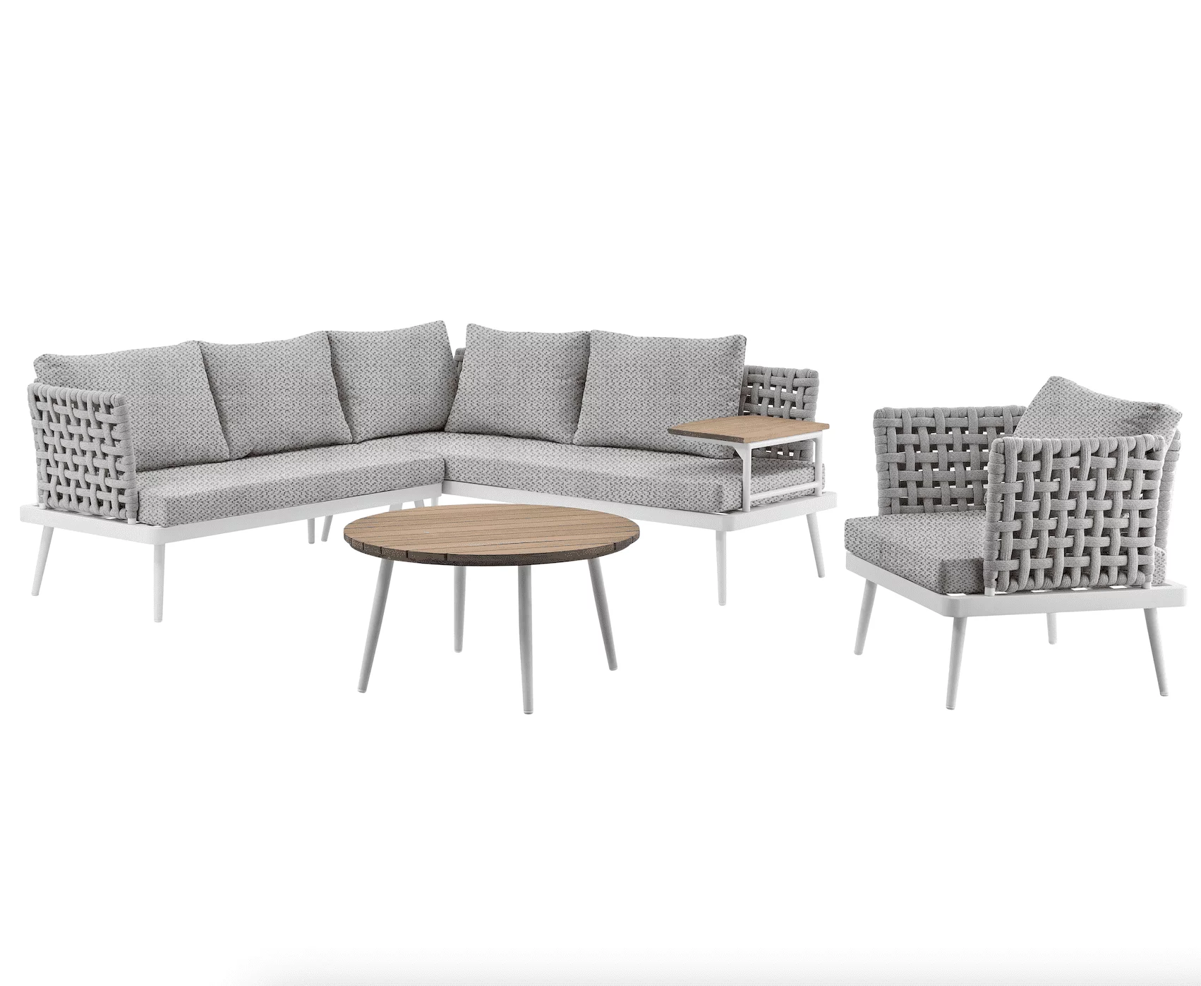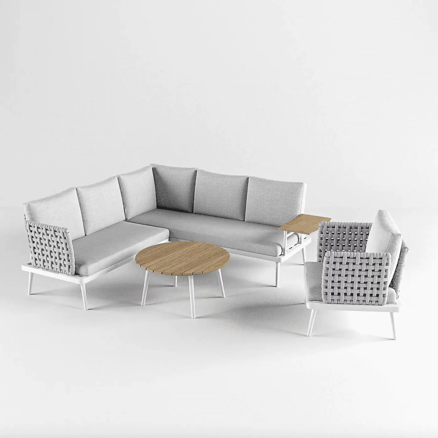 Poilsiaudami atvirose erdvėse, kuriose bus šie baldai, jausitės taip komfortiškai tarsi būtumėte svetainėje. Minkšta, maloni liesti ir orui pralaidi kampinė sofa prailgins jūsų buvimo gryname ore laiką. Todėl galėsite mėgautis saulės voniomis ištisas valandas. Komplekte yra ne tik kavos staliukas, bet ir papildomi stalviršiai prie sofos, todėl užkandžiai, desertai ir gėrimai bus jums lengvai pasiekiami net neatsistojus.