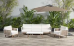 Praleiskite karštas vasaros dienas patogiai mėgaudamiesi saulės voniomis. Šis stilingas terasos baldų komplektas Martinelli Tuscan sukurs tobulas lauko erdves, kurios suburs draugus, artimuosius ar šeimos narius. Komforto jums suteiks erdvios kėdės, primenančios foteliukus, dvivietė sofa, ant kurios malonu sėdėti ir atsiremti bei elegantiškas kavos staliukas užkandžiams ir gaiviesiems gėrimams pasidėti.