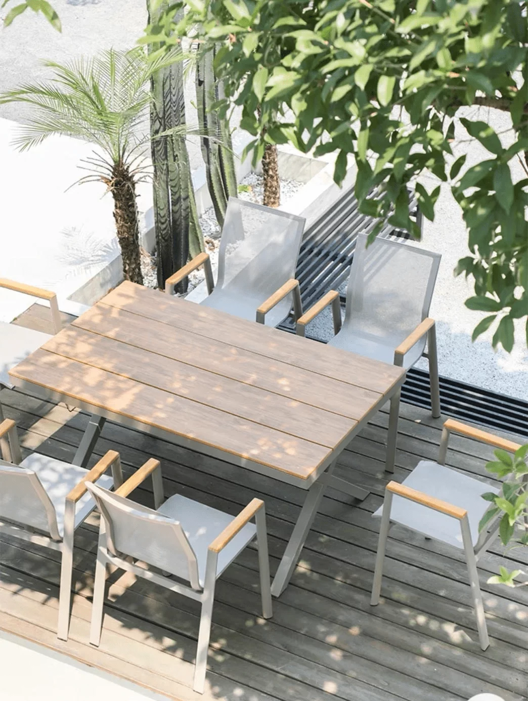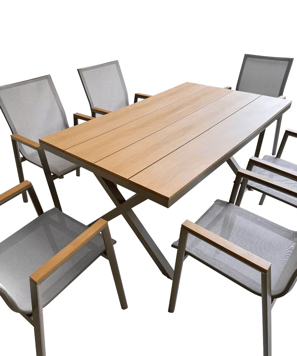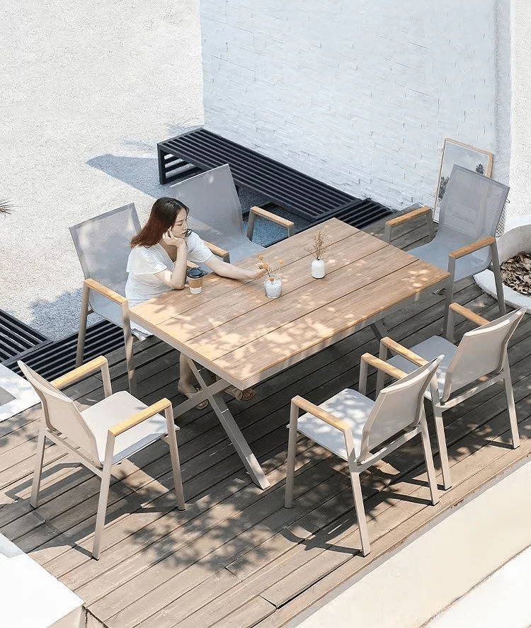 Ieškantiems natūralumo patiks lauko baldų komplekte esantys stiliaus akcentai: medienos imitacijos kėdžių porankiai ir stalo stalviršis. Švelniai rudas atspalvis suteikia baldams rafinuotumo. Todėl net ir pasibaigus šiltajam sezonui juos galima perkelti į uždaras erdves, kurioms norite suteikti šiek tiek elegancijos.