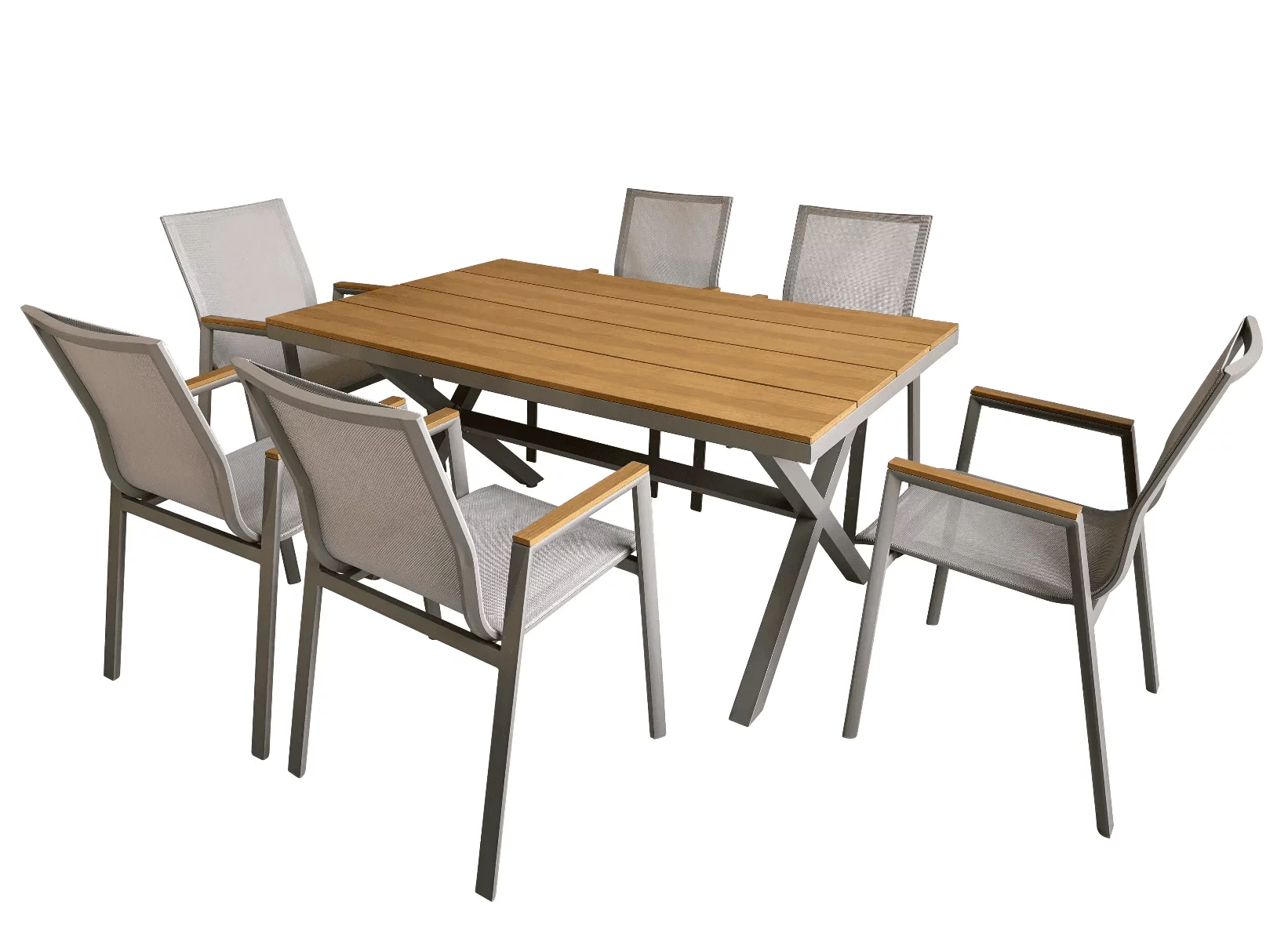 | Stalas | Milteliniu būdu dažytas aliuminis rėmas su medžio imitacijos stalviršiu (PE) |