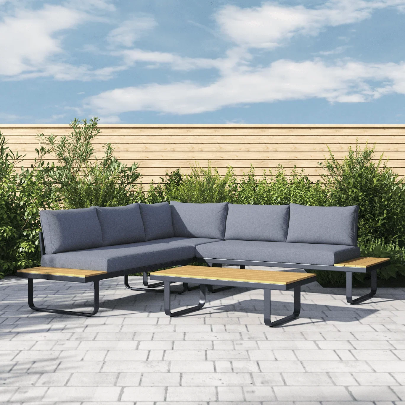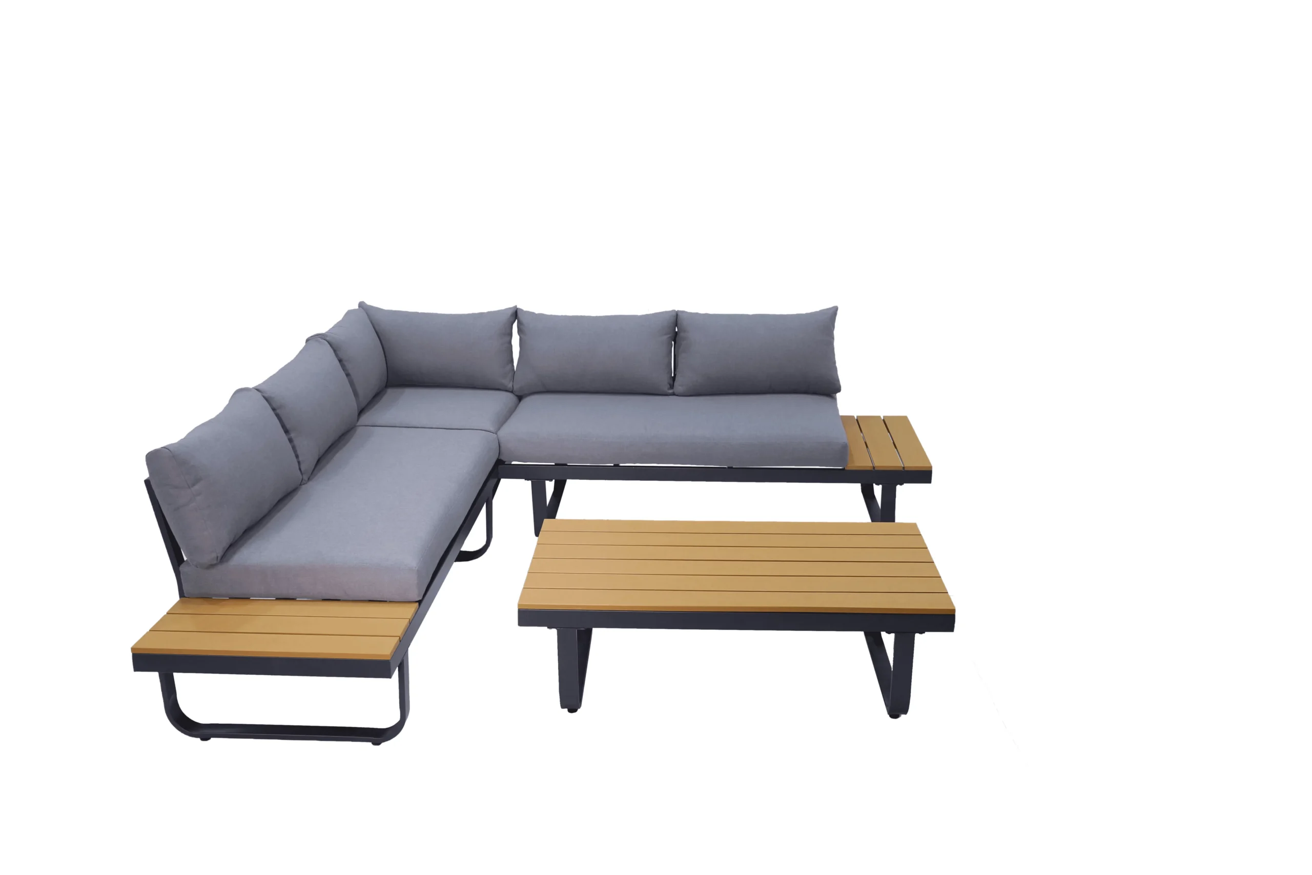 Poilsiaudami atvirose erdvėse, kuriose bus šie baldai, jausitės taip komfortiškai tarsi būtumėte svetainėje. Minkšta, maloni liesti ir orui pralaidi kampinė sofa prailgins jūsų buvimo gryname ore laiką. Todėl galėsite mėgautis saulės voniomis ištisas valandas. Komplekte yra ne tik kavos staliukas, bet ir papildomi stalviršiai prie sofos, todėl užkandžiai, desertai ir gėrimai bus jums lengvai pasiekiami net neatsistojus.