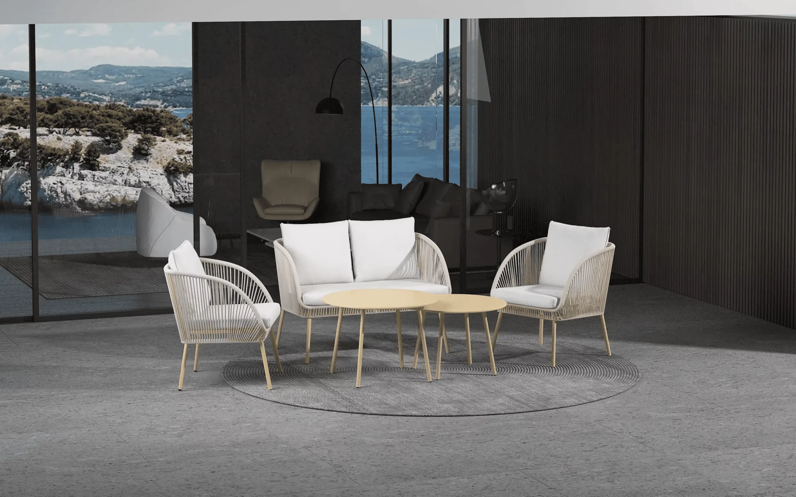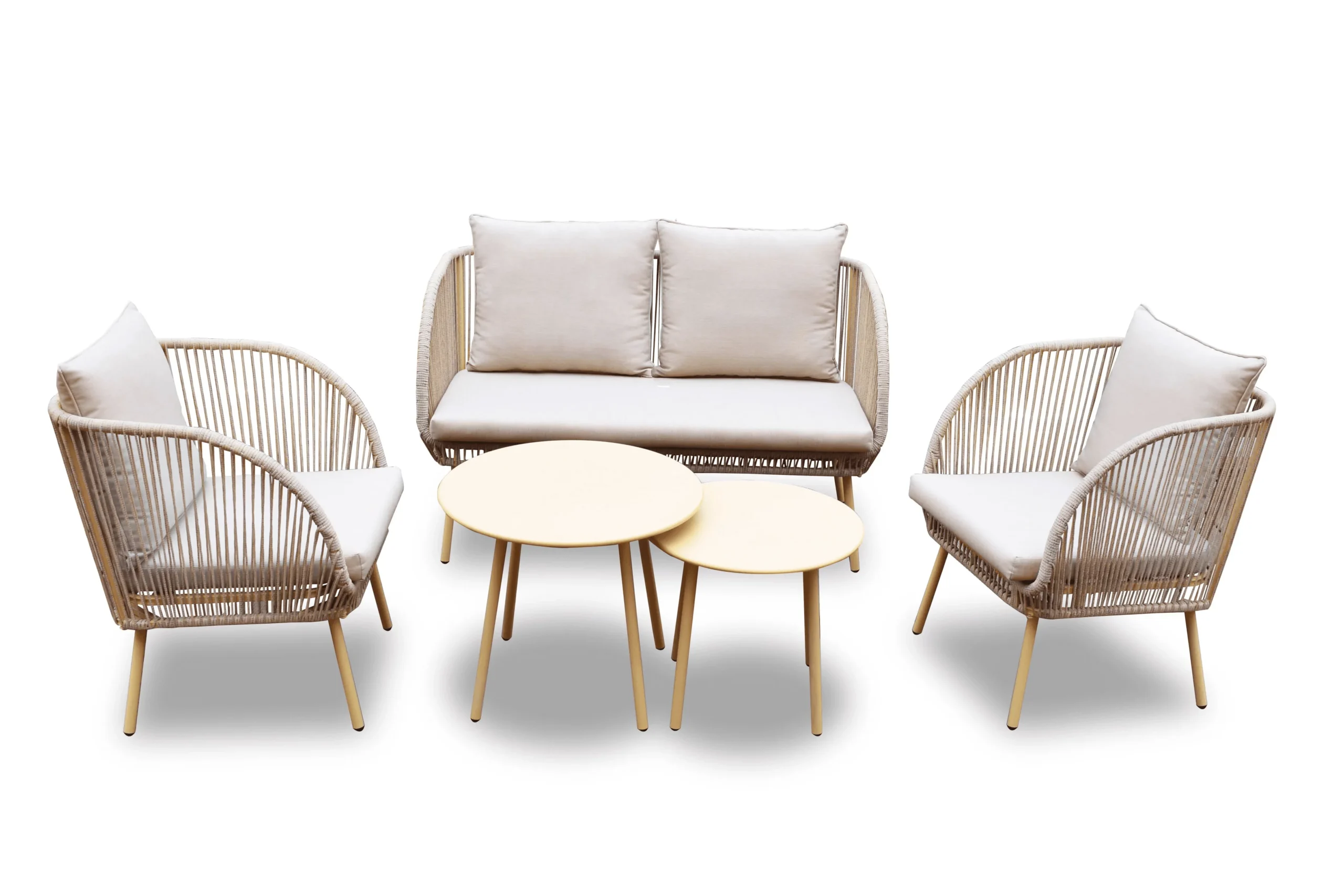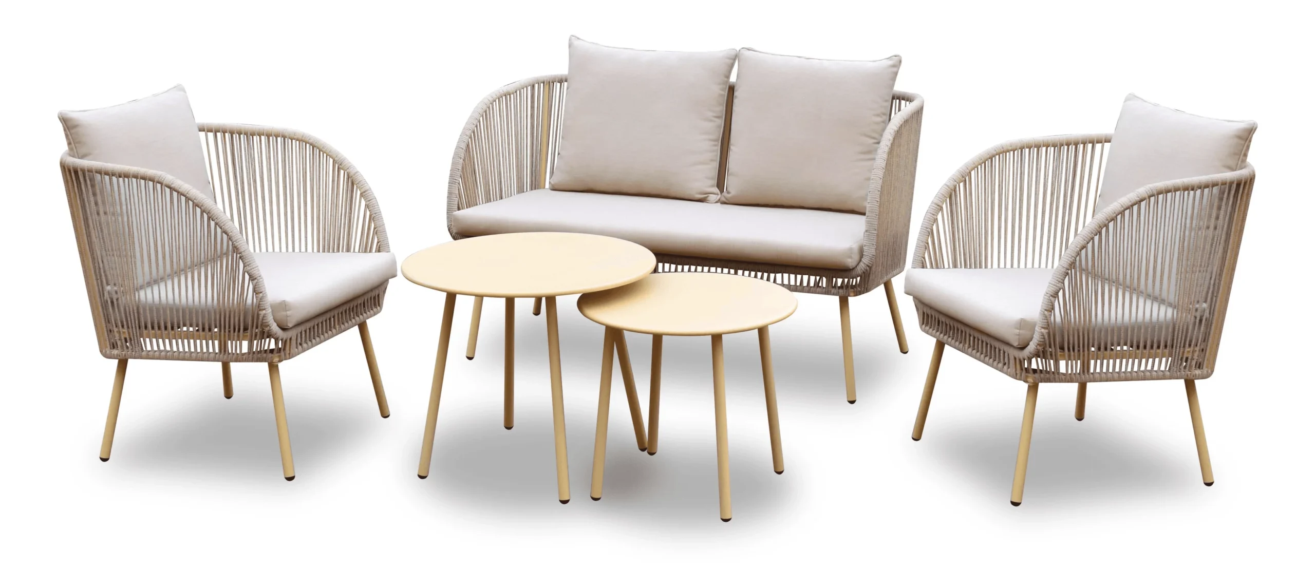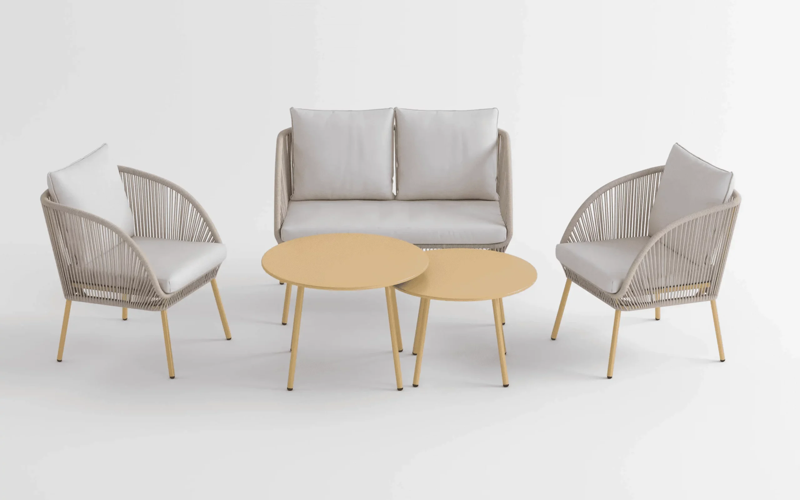 Baldų komplekte yra dvivietis ir vienviečiai krėslai, tad bus lengva išsirinkti, kuri vieta jums yra patogiausia. Du skirtingų aukščių apvalūs staliukai suteiks daugiau erdvės. Tiek jūs, tiek jūsų svečiai galės lengvai pasiekti vaišes minimaliai pakylant iš sėdimosios pozicijos.