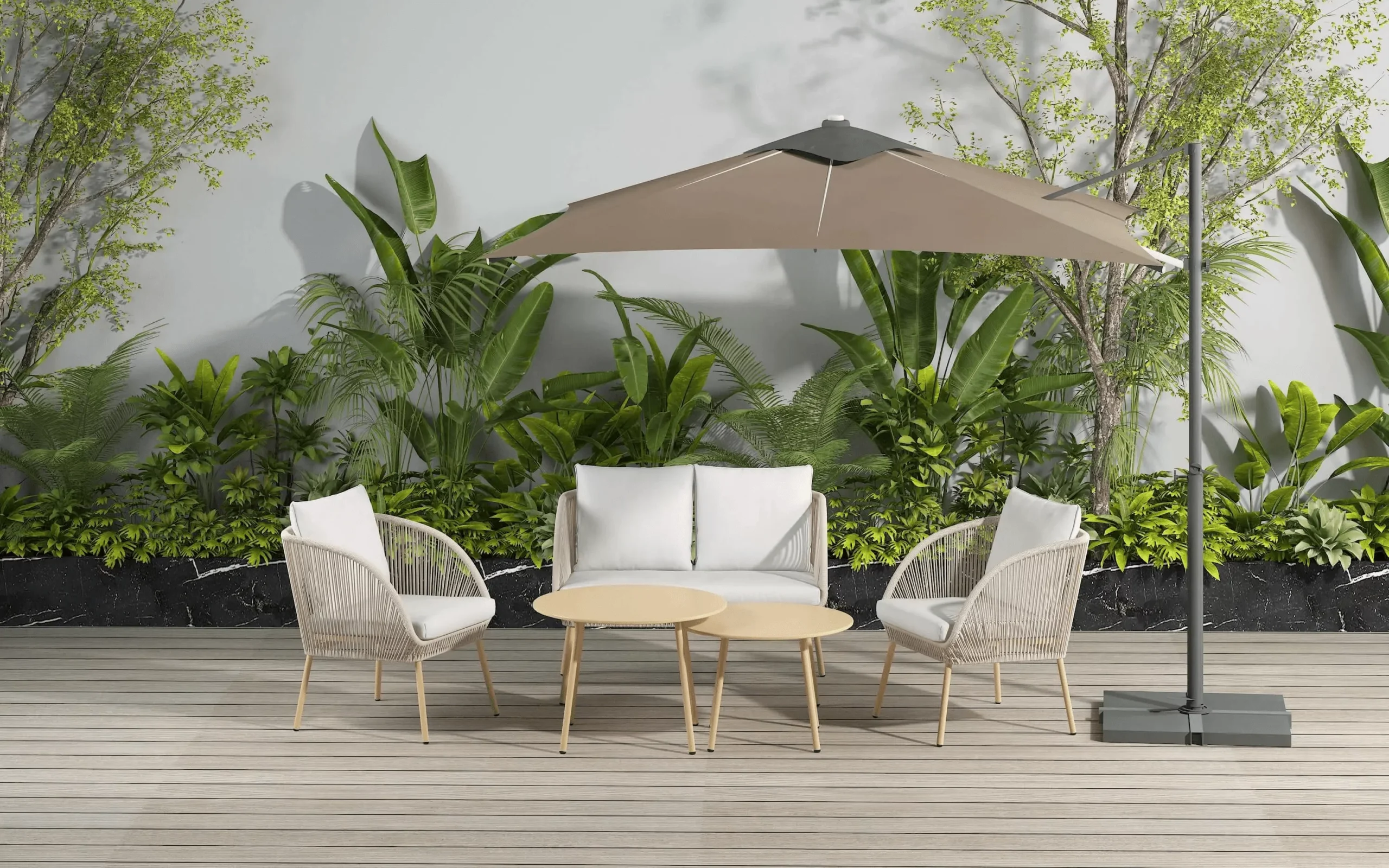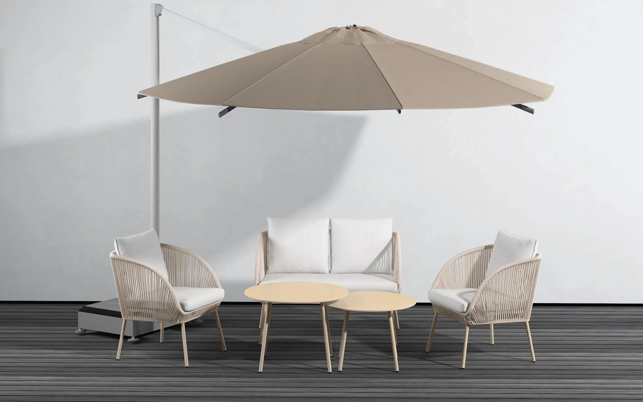 PE virve pintos apdailos detalės baldams suteikia ne tik minkštumo, bet ir atrodo tarsi sukurti rankomis. O gabardino pagalvėlės yra itin atsparios teplumui. Abi šios medžiagos yra skirtos lauko baldų gamybai, todėl sušlapę baldai greitai išdžiūva, o spalvos per ilgą laiką išlieka nepakitusios.