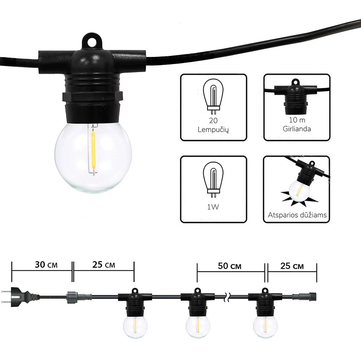 • Jeigu nuo vietos, kurioje kabinsite lemputes iki elektros lizdo yra didesnis atstumtas, tuomet galite įsigyti papildomą lempučių girliandų prailginimo kabelį. Pasirinkti galite iš baltos ir juodos spalvos priklausomai nuo lempučių girliandos laido spalvos.