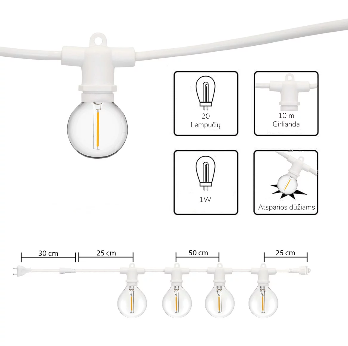 50 m lempučių girlianda Retro už gerą kainą – puikus pasirinkimas lauko ar vidaus erdvėms puošti! Modelis Retro išsiskiria tuo, jog LED lempučių girliandos laidas yra juodos spalvos, todėl sukuriamas tvarkingas vaizdas aplinkoje, o galimybė jungti tarpusavyje iki 800 metrų leidžia dekoruoti dideles erdves ar objektus.