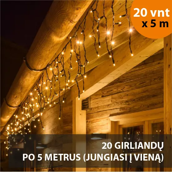 Šia girliandą sudaro: 20 vnt. Lauko girlianda varvekliai PROLED IP67 5m (jungiasi tarpusavyje)