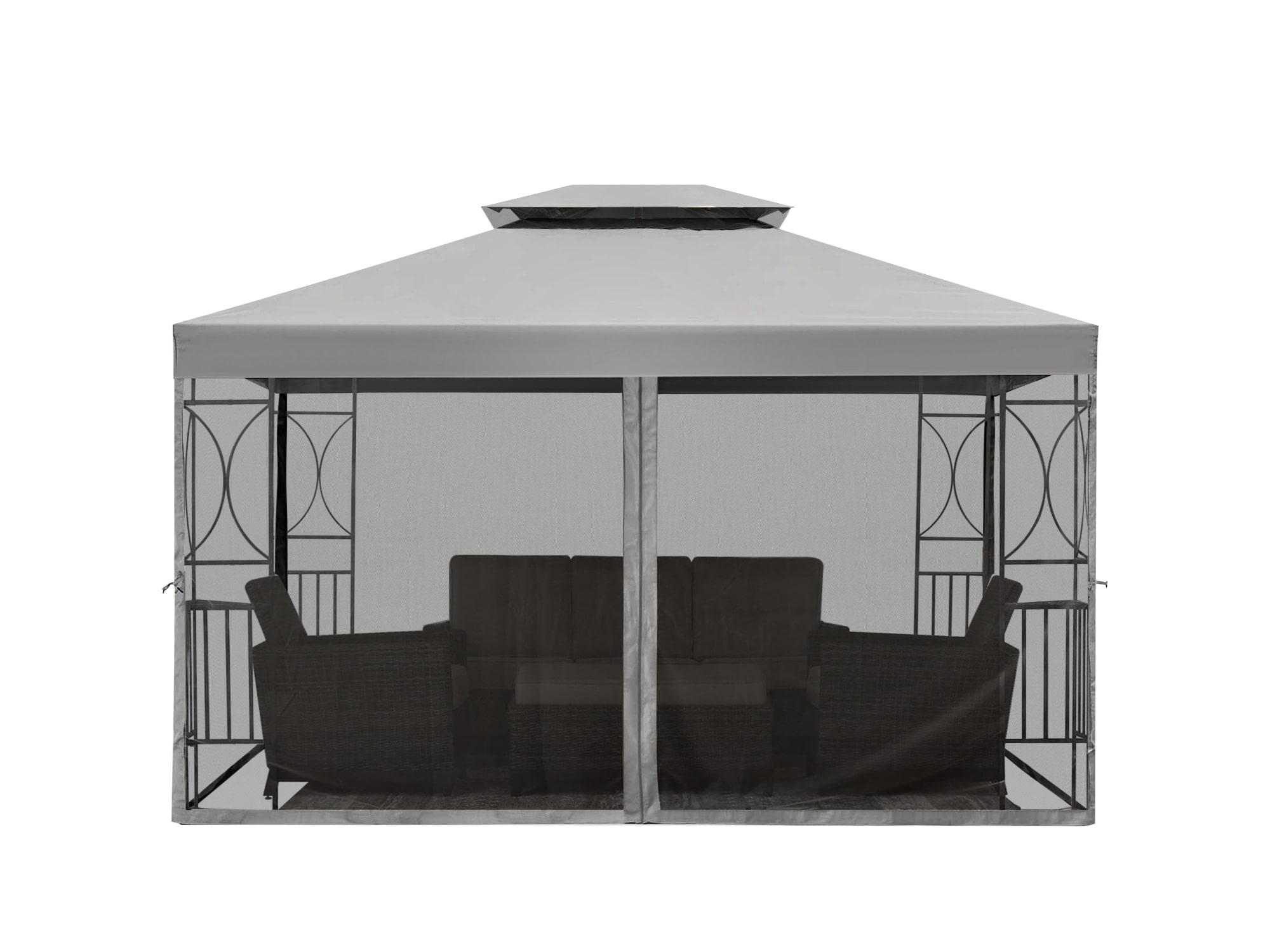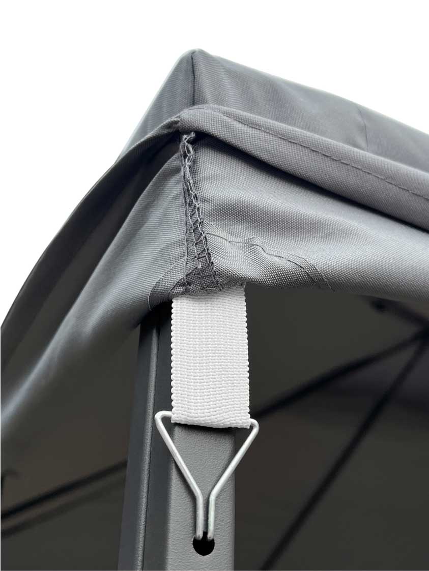 Pavėsinės stogo audinys yra pilkos spalvos bei atsparus vandeniui, o tinklelis pagamintas iš patvarios medžiagos, kuri puikiai praleidžia orą. Stogas prie rėmo tvirtinamas specialiais kabliais, ko pasekoje užtikrinamas tvirtumas.