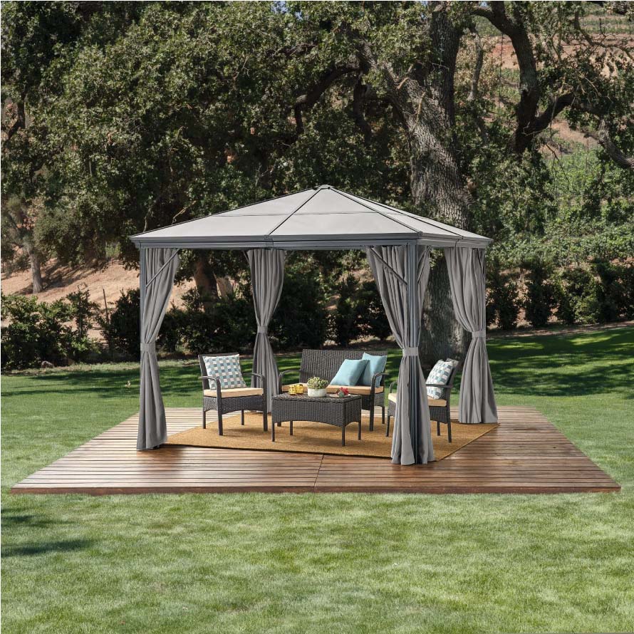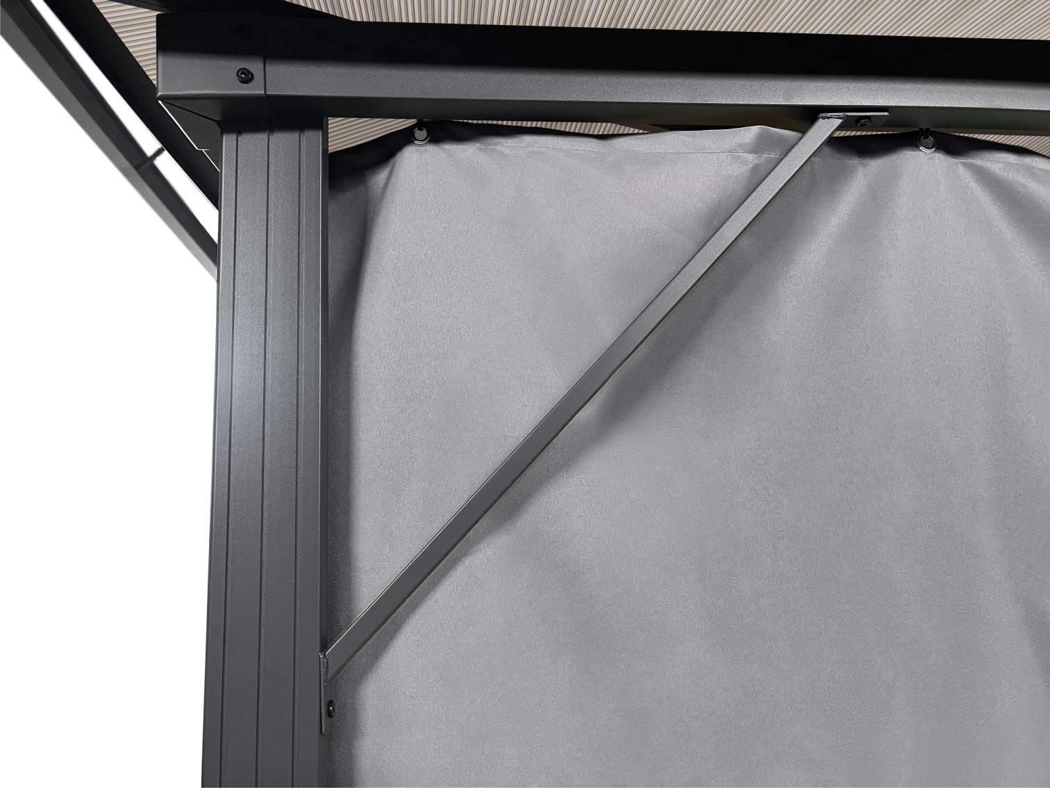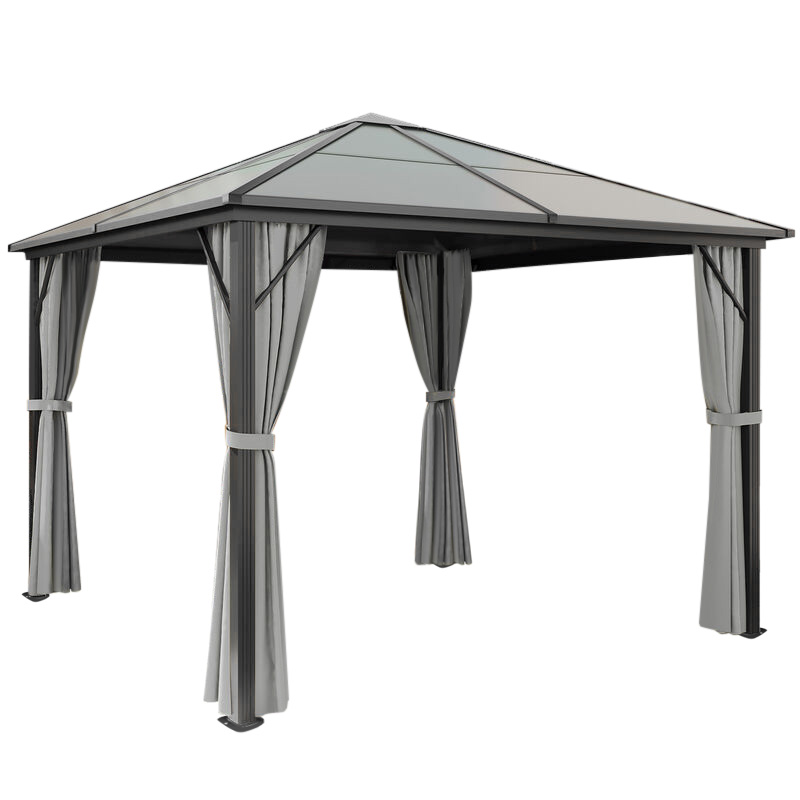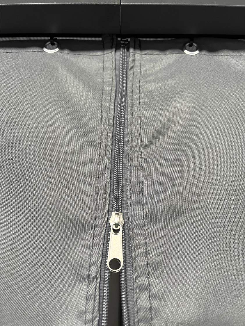 Ši pilkos spalvos pavėsinė yra universali ir puikiai tiks naudoti tiek karštą, saulėtą dieną, tiek ir lyjant lietui. Pavėsinės sienos slankioja ir gali būti uždaromos, jas sujungiant užtrauktukais. Būtent dėl šios priežasties jūs galėsite patys nuspręsti kurias sienas palikti atviras, o kurias uždaryti ir taip susikurti malonią užuovėją. Paliekant pavėsinę ilgesniam laikui ir norint apsaugoti pavėsinėje esančius baldus ar kitą įrangą, galėsite ją pilnai uždaryti.