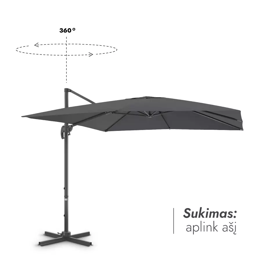 | Papildomos skėčio funkcijos | Sukasi 360 laipsnių, reguliuojasi vertikaliai. |