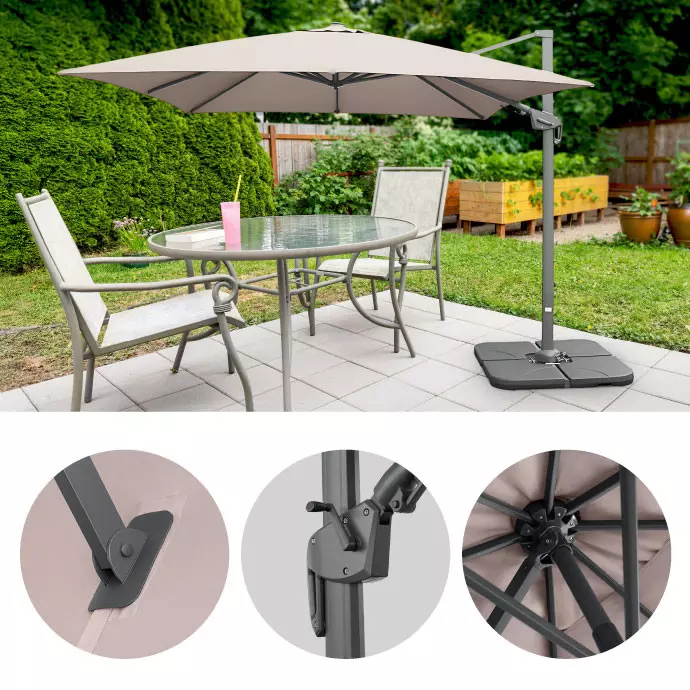 Lauko skėčio audinio storis siekia net 220g/m2, o apsauga nuo kenksmingų saulės spindulių įvertinta rodikliu UV50+. Šie techniniai duomenys rodo, jog audinys yra tvirtas, kokybiškas, ilgaamžis ir puikiai apsaugo net itin saulėtą dieną. Audinys – 100 % vandeniui atsparus poliesteris, todėl lauko skėtis puiki uždanga nuo lietaus, o siuvimui naudojamos dvigubos siūlės atlaiko ir stiprų vėją.