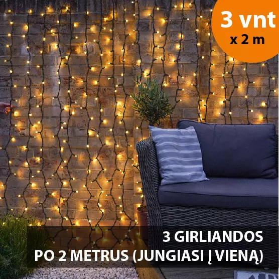 Šia girliandą sudaro: 3 vnt. Lempučių užuolaida (girlianda) PROLED IP67 2×2 m (jungiasi tarpusavyje)