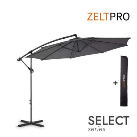 Antracito spalvos Select modelio pastatomų lauko skėčių konstrukcija gaminama naudojant pažangiausias konstrukcinių profilių gamybos technologijas, todėl yra sertifikuota ir pasižymi atsparumu bei tvirtumu. Stogo konstrukciją sudaro aštuoni plieniniai strypai (18×12 mm), o stovas yra pagamintas iš 48 mm plieno, kuris pramoniniu būdu padengtas korozijai atspariais dažais. Kokybiškos metalinės profilio jungtys pritaikytos dažnam naudojimui.